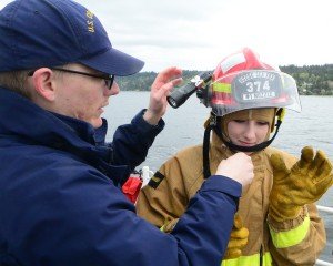 Petty Officer 2nd Class Mika Cornelius, a damage controlman, helps Petty Officer 1st Class Carrie Guyt, Bremerton High School Naval JROTC, don fire fighting equipment aboard the Coast Guard Cutter Sea Fox, an 87-foot Patrol Boat homeported in Bangor, Wash., while underway near Bremerton, Wash., April 13, 2015. Bremerton High School JROTC members spent the day underway aboard Sea Fox to gain a better understanding of Coast Guard assets and missions. (U.S. Coast Guard photo by Petty Officer 1st Class George Degener)