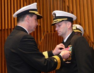 BANGOR, Wash. (Apr. 6, 2015) Rear Adm. Dave Kriete, commander of Submarine Group 9, left, presents Capt. Mark Behning, commodore of Submarine Squadron 17, right, with the Legion of Merit during a change of command ceremony at Naval Base Kitsap – Bangor. (U.S. Navy photo by Mass Communication Specialist 1st Class Kenneth G. Takada/Released)