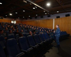 BANGOR, Wash. (April 9, 2015) Commander Submarine Force U.S. Pacific Fleet Force Master Chief Russell Mason speaks to Sailors during an all-hands call at the Naval Base Kitsap-Bangor base theater. (U.S. Navy photo by Mass Communication Specialist 1st Class Kenneth G. Takada/Released)