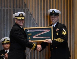 BANGOR, Wash. (Apr. 21, 2015) Cmdr. Jeffery Smith, outgoing commanding officer of USS Kentucky (SSBN 737), left, is presented the ship’s pennant by Kentucky’s chief’s mess during a change of command ceremony at the Naval Base Kitsap – Bangor base chapel. (U.S. Navy photo by Mass Communication Specialist 1st Class Kenneth G. Takada/Released)
